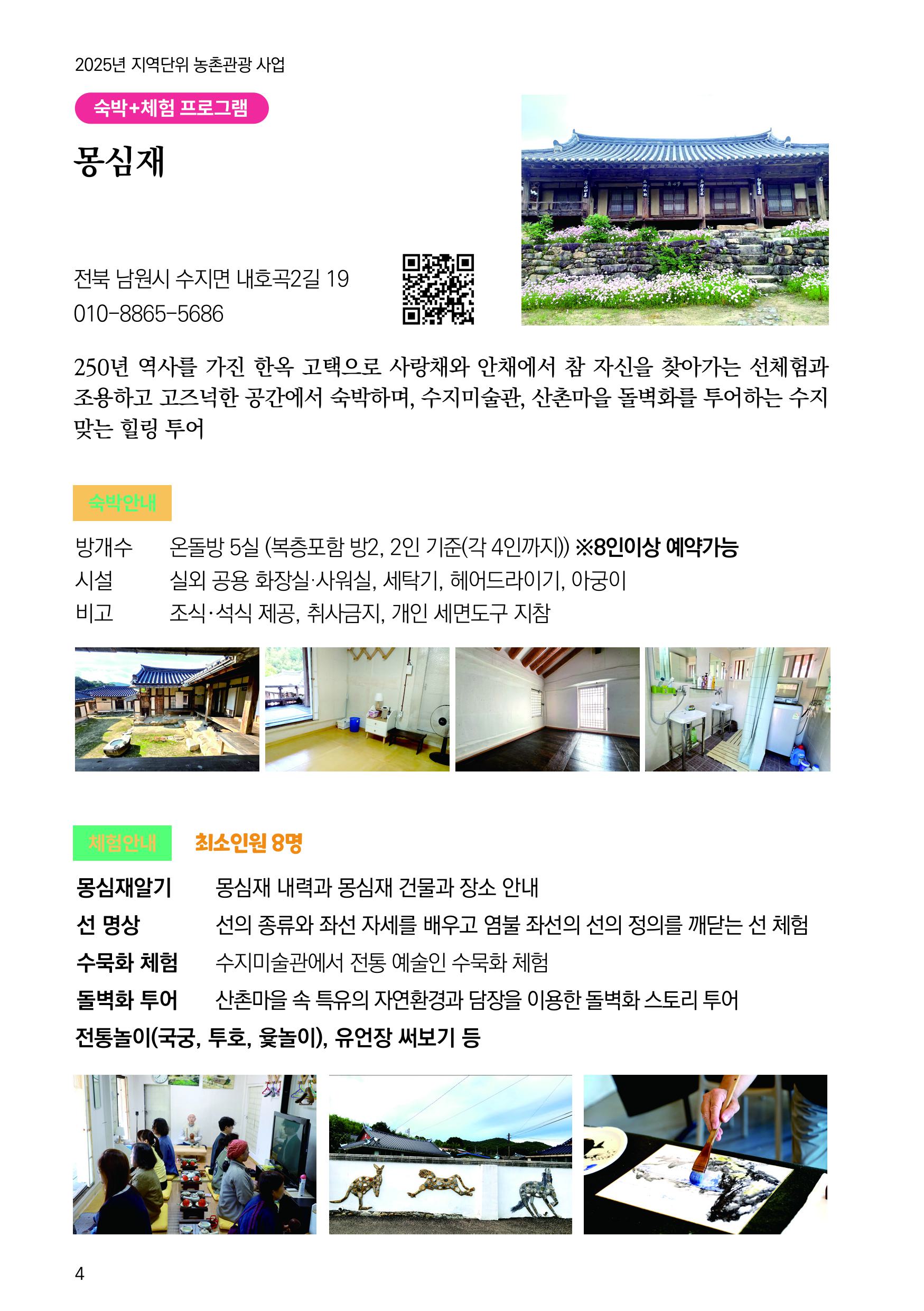 🌿 일상에서 잠시 벗어나, 마음을 쉬어가는 시간 남원의 고즈넉한 자연 속에서 진정한 힐링을 만나보세요. 몽심재 힐링 투어가 여러분을 기다립니다 ✨ 🍃 맑은 공기와 푸른 자연 🍵 따뜻한 차 한 잔의 여유 🧘 몸과 마음을 치유하는 특별한 체험 바쁜 일상에 지친 당신에게 남원이 선물하는 작은 쉼표, 몽심재에서 만나요 |