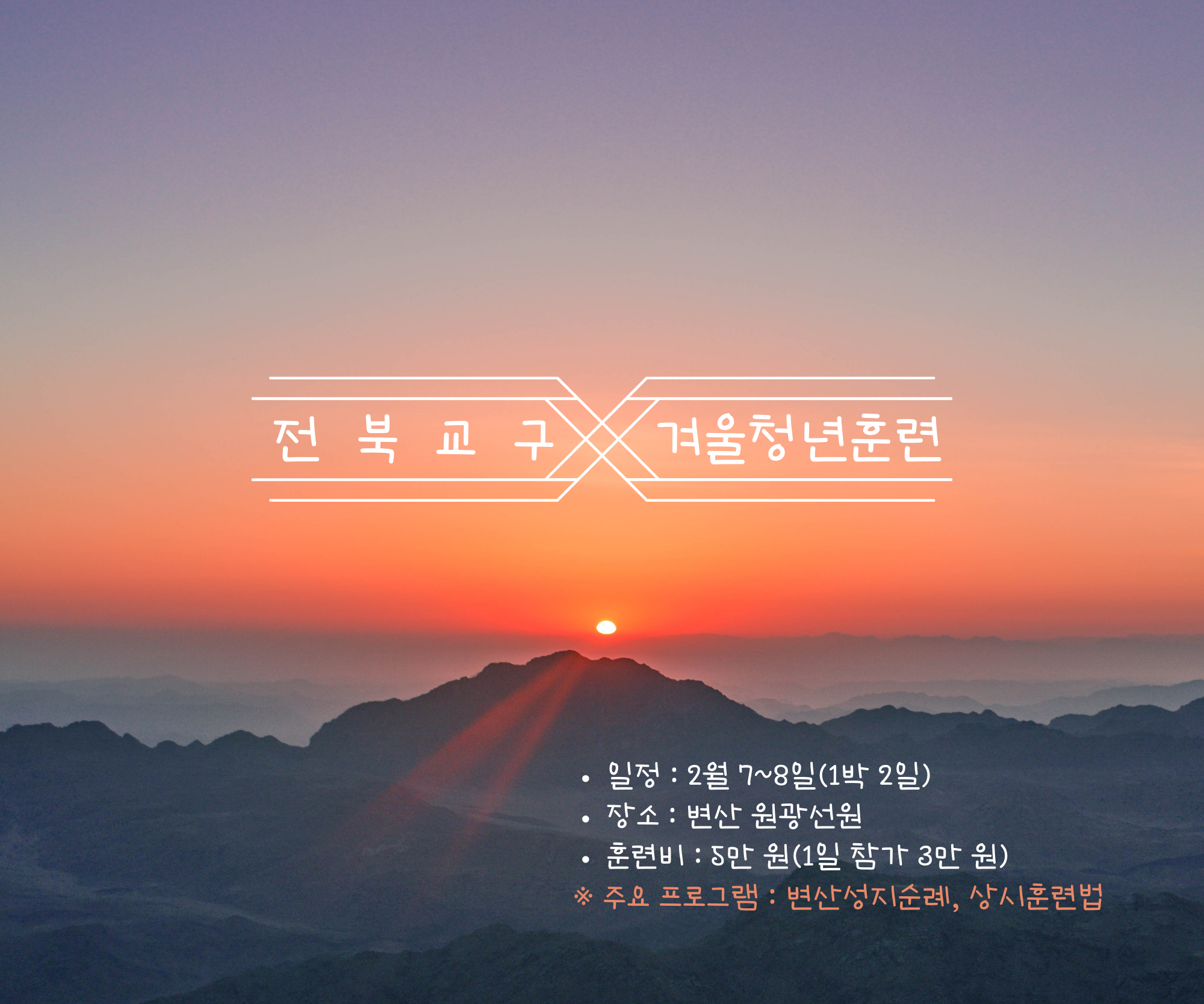 - 일시: 2월 7일(토) ~ 2월 8일(일)(2박 3일에서 1박 2일로 변경 됐습니다.)