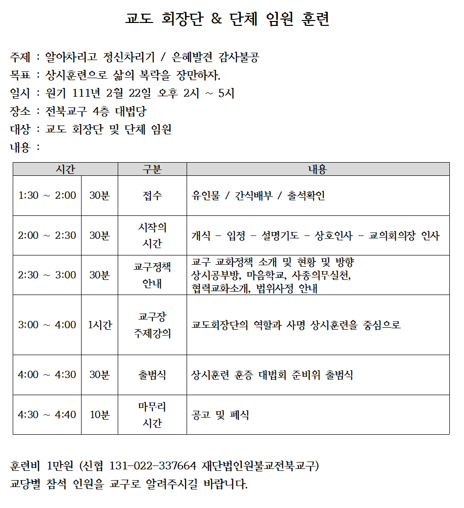교도 회장단 & 단체 임원 훈련 일정 안내입니다.
