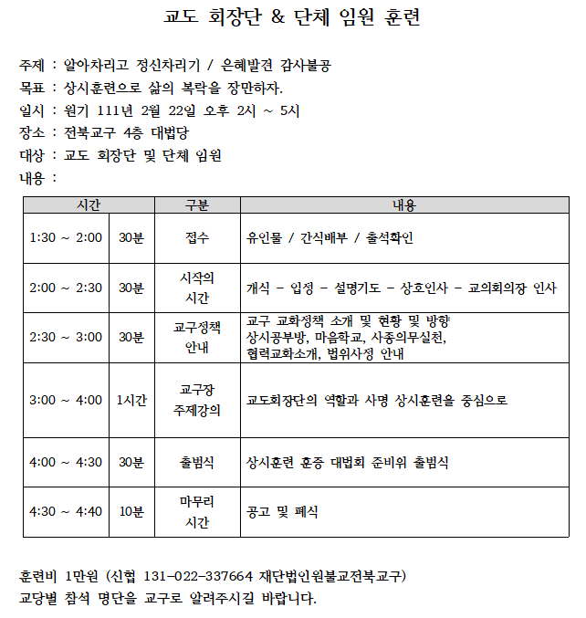 교도 회장단 & 단체 임원 훈련 일정 안내입니다.